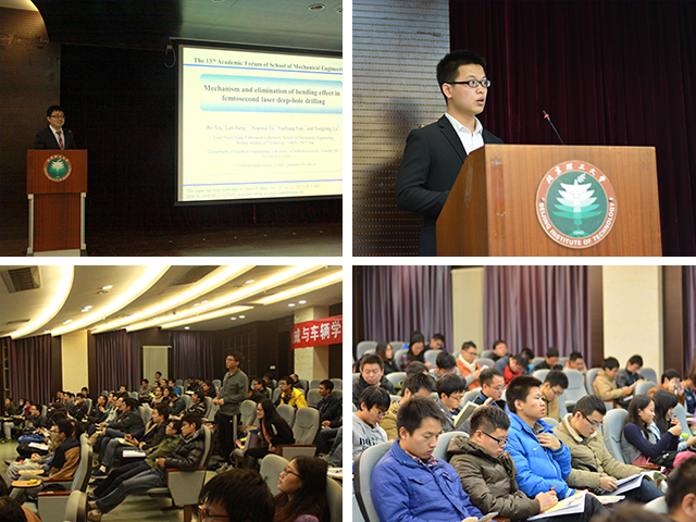 何洪文、龚建伟、郑长松、孙柏刚、熊建银、刘福水、杨策、韩恺、黄杰、周天丰、胡洁、王文中、郭宏伟老师担任了两个分论坛的评委,20名入围选手各自进行了精彩的学术报告,将自己的学术成果深入浅出的呈现给现场的观众,同时和观众们交流了各自进行科研学术工作中的点滴经验,让到场的研究生和即将进入研究生生涯的本科生对科研工作有了充足的认识和准备。其中来自激光微纳制造研究所的博士生夏博将他的论文《Mechanism and elimination of bending effect in femtosecond laser deep-hole drilling》进行了鞭辟入里的讲解,他在研究飞秒激光微孔钻过程中,理论推导结合不断的实验,解决了长深径比微孔的弯曲问题,得到了导师们的认可和观众们的掌声。