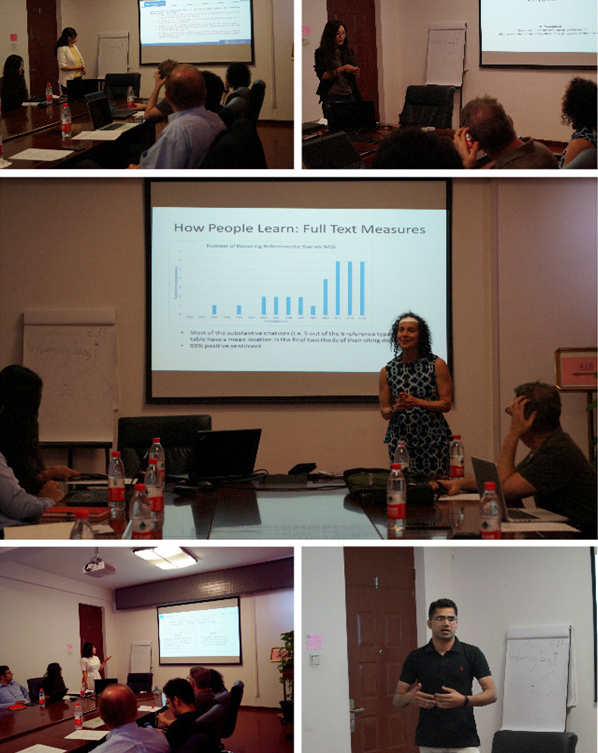 Jan Youtie教授做题为“Cross borders: A citation analysis of connections between Cognitive Science and Educational Research and the fields in between”的学术报告。郭颖老师以 “A Systematic Method for Technology Assessment: Illustrated for ‘Big Data’”为题,介绍了其以“大数据”行业为案例开展技术评估的最新研究进展。李燕超博士做题为“Differential Outcomes to Strategy: Exploring Factors Shaping Returns to Innovation Policy in China and Russia”的报告,介绍了中俄创新政策的对比研究。此外,来自知识管理与数据分析实验室博士生王志楠、Omer分别以“The research scope evolutions of leading teams in GMO field: a bibliometrics analysis”和“Factors sets interaction(FSI): a case study in brain cancer”为题进行了精彩的报告。