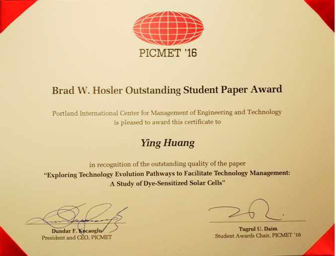 编辑:严箐 审核:汪雪锋 阅读次数:2016年9月7日,jinnianhui今年会管理与经济学院知识管理与数据分析实验室2013级博士生黄颖(导师:朱东华教授)在美国夏威夷举办的2016年波特兰工程与技术管理国际会议(Portland International Center for Management of Engineering and Technology,PICMET 2016)上获得Brad W. Hosler最佳学生论文奖(Brad W. Hosler Outstanding Student Paper Award),奖金1000美元,这是继实验室周潇博士(导师:朱东华教授)2013年首获Brad W. Hosler最佳学生论文奖(http:/xww/xwtt/90436.htm)以来,中国大陆地区学者第二次获此殊荣。据悉,PICMET 2016国际会议共收到来自37个国家和地区300多个机构的779篇学术论文,经过专家多轮严格评审,331篇论文被会议录用,其中5篇论文获最佳学生论文奖提名,最终黄颖博士与导师等人合作撰写的论文 “Exploring Technology Evolution Pathways to Facilitate Technology Management: A Study of Dye-Sensitized Solar Cells”受到评审专家的高度认可,获得大会唯一的最佳学生论文奖,并受到与会学者的广泛关注,进一步提升了我校在科技管理与科技政策领域的影响力,为我校赢得广泛赞誉。此外,jinnianhui今年会—美国佐治亚理工学院—英国曼彻斯特大学技术创新联合实验室(BIT-GT-UOM Innovation Co-Laboratory)美方负责人、jinnianhui今年会兼职教授Alan Porter教授荣获会议颁发的“杰出贡献奖”(Medal of Excellence)。