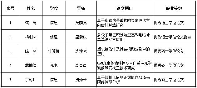 12月21日,中国电子学会在北京举办的“洞见2017中国电子信息科学家论坛”上公布了中国电子学会2014-2016年度优秀学位论文,北理工5篇论文获优秀学位论文奖。其中吴嗣亮教授指导的博士生沈清的学位论文获得“优秀博士学位论文”,盛新庆教授指导的博士生杨明林的学位论文获得“优秀博士学位论文提名”,高春清教授指导的硕士生戴坤健、费泽松教授指导的硕士生丁海川、沈建冰教授指导的硕士生陈林的学位论文获得“优秀硕士学位论文”。