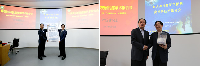 随后,叶培建院士作了题为《有人参与的深空探测突出科技问题》的报告。报告中,他强调虽然目前无人深空探测取得了值得骄傲的成绩,但由于人类对未知世界的好奇心、人类对拓展生存空间的渴望、人区别于机器人的智慧和才能以及引领科研和工程技术的战略意义,深空探测技术由无人向有人的转变是非常有必要的。他明确了载人深空探测的内涵,系统地梳理了载人深空探测的发展历程,前瞻了载人深空探测的发展趋势。同时面向我国以载人登月工程为代表的载人深空探测发展的长远战略需求,系统地分析了开展载人深空探测所面临的关于宇航员去登回、驻扎月球、工作以及健康伦理四个方面的关键科学和技术问题,提炼了18个应优先发展的前沿科学技术突出问题,并提出了发展该学科领域的政策措施。