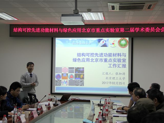 张加涛教授代表结构可控先进功能材料与绿色应用北京市重点实验室围绕重点实验室建设情况和经费使用情况、主要研究方向和研究内容、2016年实验室取得的研究成果和下一步发展规划等方面向与会的各位专家领导作了汇报。