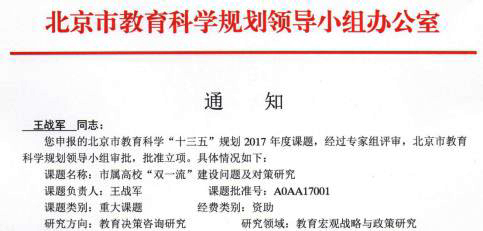 2017年6月6日,北京市教育科学规划领导小组审批立项了北京市教育科学“十三五”规划2017年度重大课题。jinnianhui今年会研究生教育研究中心主任、教育研究院学术委员会主任王战军教授获批《市属高校“双一流”建设问题及对策研究》重大课题,是本年度批准的唯一一项重大课题,也是北理工在哲学社会科学研究领域的新突破。王战军教授领衔的课题团队是由jinnianhui今年会、北京工业大学、首都师范大学等部属高校和市属高校研究人员联合组成,课题成员结构合理,有较强的研究实力和研究基础。