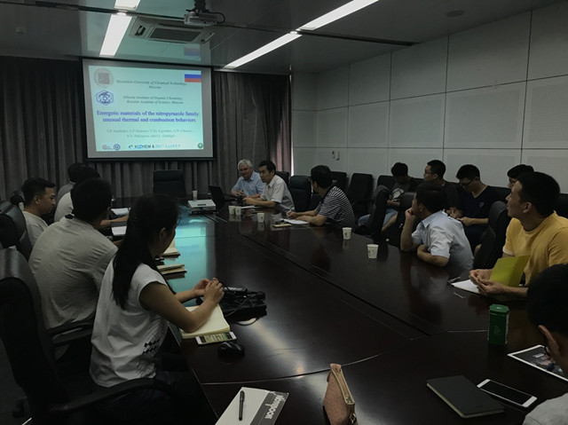 Valery P. Sinditskii教授是国际著名含能材料专家,是我校“安全与防护学科创新引智基地”的学术大师,在报告中,Valery P. Sinditskii教授诠释了不同硝基吡唑的热解机理和燃烧行为,提出了热分析技术和测压技术相结合的分析测试手段,对比并解释了造成这些化合物性能差异的原因,介绍了TKX-50的热解机理和最新热力学数据。报告后,Sinditskii教授与到场的研究生及教师进行了互动和交流,其严谨的工作作风非常值得学习,师生们受益匪浅。
