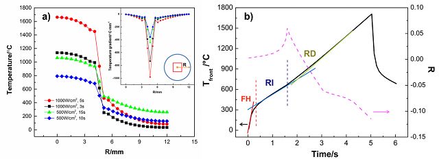 图2 连续型激光作用下的La1-xSrxTiO3+δ涂层表面(a)温度梯度变化 (b)反射率变化