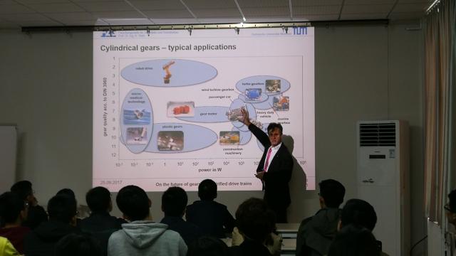 近日,德国慕尼黑工业大学机械系教授、德国齿轮研究中心(FZG)主任Karsten Stahl教授访问机械与车辆学院并开展学术交流活动。访问期间,Stahl教授做了题为“On the future of gear in electrified drive trains”的学术报告。Stahl教授重点介绍了齿轮传动在当代乘用车的应用,在此基础上介绍了电动车所用齿轮传动,设计方法,齿轮在电动车中应用的必要性,存在的问题、发展趋势,特别是结合与世界著名车企BMW合作进行电动车研发过程中齿轮传动所要解决的功率密度问题、效率问题和噪声的问题。Stahl教授报告内容丰富,讲述生动,引起了与会师生的浓厚兴趣,同学们就报告内容进行了深入讨论。通过相关领域国际前沿知识的介绍,有助于拓展研究生的国际视野、夯实专业基础、提高专业学习兴趣。