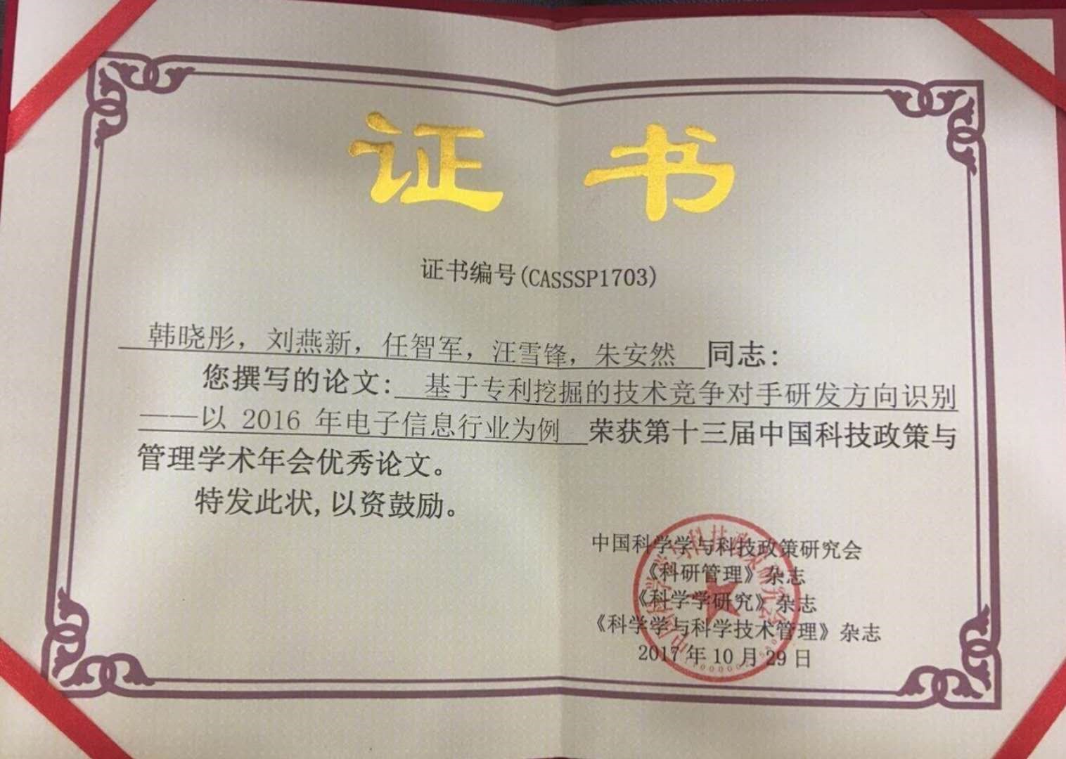 2017年10月28-29日,jinnianhui今年会知识管理与数据分析实验室2017级博士生韩晓彤在第十三届中国科技政策与管理学术年会上获得优秀论文奖,受到与会学者的广泛关注,进一步提升了我校在技术创新管理和科技政策领域的影响力,为我校赢得广泛赞誉。据悉,本次会议共收到来自国内高校、科研院所及企事业单位专家学者的380余篇学术论文,经专家多轮严格评审,最终16篇论文获优秀论文奖。中国科学学与科技政策研究会理事长穆荣平研究员为获奖作者颁发优秀论文证书。