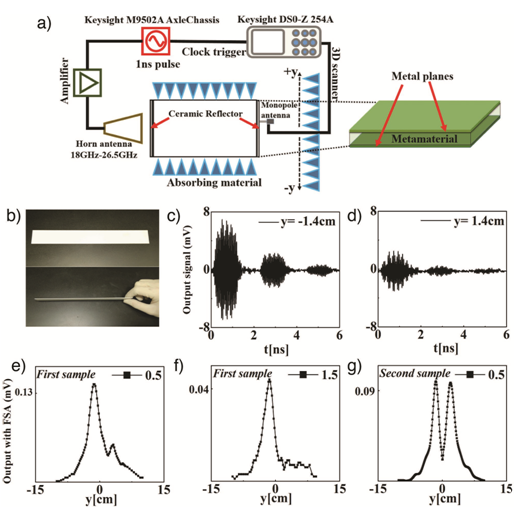 图3 (a)微波实验平台。(b)反射镜。(c)-(g)超材料完成量子搜索算法的实验结果。