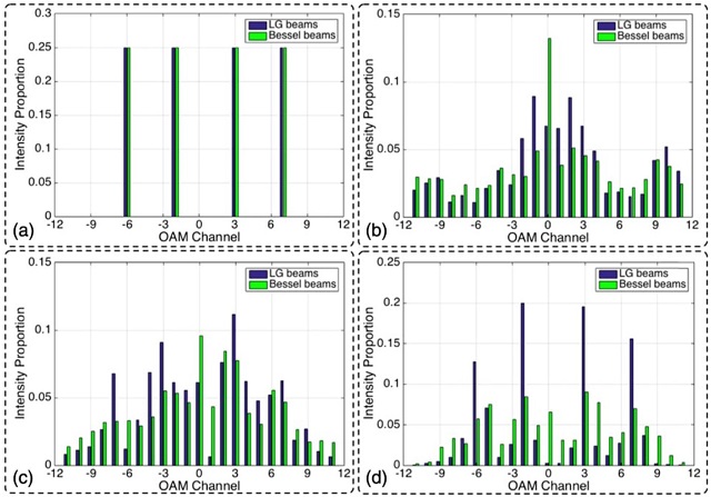 涡旋光束是指具有螺旋相位分布的光束,是近年来光学领域国内外学者研究的热点之一。涡旋光束携带有轨道角动量(orbital angular momentum, OAM),其本征值可取任意整数,不同OAM态可构成一无穷维希尔伯特空间。将光的OAM引入光通信系统,可为光通信系统提供一种新的维度,极大提高光通信系统的信息传输能力。但是,当携带有OAM的涡旋光束经过大气湍流等不均匀介质传输时,会发生波前畸变,产生OAM谱展宽效应,进而使得系统的误码率显著上升,降低了通信质量。为了解决这一问题,该课题组在建立的大气湍流理论模型基础上,系统的分析了拉盖尔高斯光束和贝塞尔高斯光束这两种最常见的涡旋光束,经不同强度的湍流后的OAM谱展宽效应,受期刊编辑的邀请,研究结果以 “Influences of atmospheric turbulence effects on the orbital angular momentum spectra of vortex beams”为题,发表在Photonics Research [Vol. 4, Issue 5, pp. B1-B4 (2016)]上。