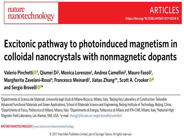 北京时间2017年12月18日,北理工张加涛教授与意大利米兰比可卡大学Sergio Brovelli教授合作(共同通讯作者)在国际纳米科技权威杂志《自然·纳米技术》在线发表了最新研究成果“Excitonic Pathway to Photoinduced Magnetism in Colloidal Nanocrystals with Nonmagnetic Dopants”。