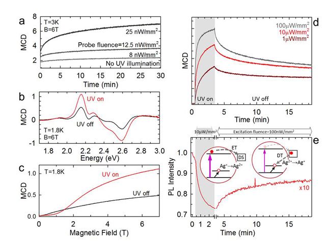 Ag+作为一类新兴掺杂元素,常用于III-V族和II-VI族半导体纳米材料中。Ag+的掺杂引入带间能级,并能够与主体导带形成光学耦合。因为其4d轨道全满,所以Ag+是非磁性的。掺杂引起的荧光归因于光激发的空穴转移到Ag+之后与导带电子的复合。这种光活化过程和Ag+电子构型的相关变化机理仍不清楚。基于此,jinnianhui今年会张加涛教授课题组与意大利Brovelli教授课题组合作,全面系统的研究了Ag掺杂CdSe纳米晶的激发衰减过程。他们发现一个有趣现象,光生空穴的捕获致使Ag+转变成顺磁性的Ag2+。激子的复合过程与光诱导磁性有着不可分割的关系。他们观察到强烈的光活化磁性和半导体纳米材料的稀磁行为。这一研究结果表明通过非磁性杂质掺杂而诱导的激发过程可以获得光学可转换的磁性纳米半导体材料。实现其光、电、磁学性能有效调控,促进其在光电自旋器件的应用!