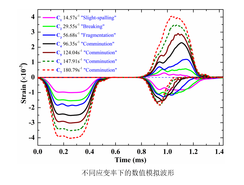 在此基础上,进行了不同应变率下Ф120×100mm混凝土试件SHPB原型实验数值模拟,重现了实验中混凝土试件的四种典型的破坏形态的形成过程,观察到实验中出现的反射波“压缩波”现象和“双峰”现象,并预测了更高应变率下混凝土试件的破坏形态、波形特征和应力平衡失效。引入损伤失效体积的概念,分析了混凝土试件SHPB实验中的应力平衡失效与波形特征之间的关系以及应力平衡失效后的材料行为,探讨了骨料和砂浆之间的粘结层(ITZ)对波形特征的影响以及波形特征如何表征混凝土材料性能。
