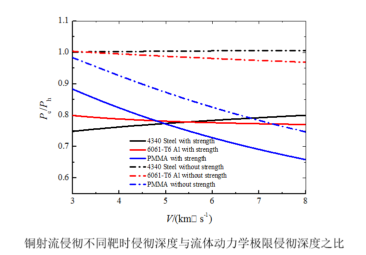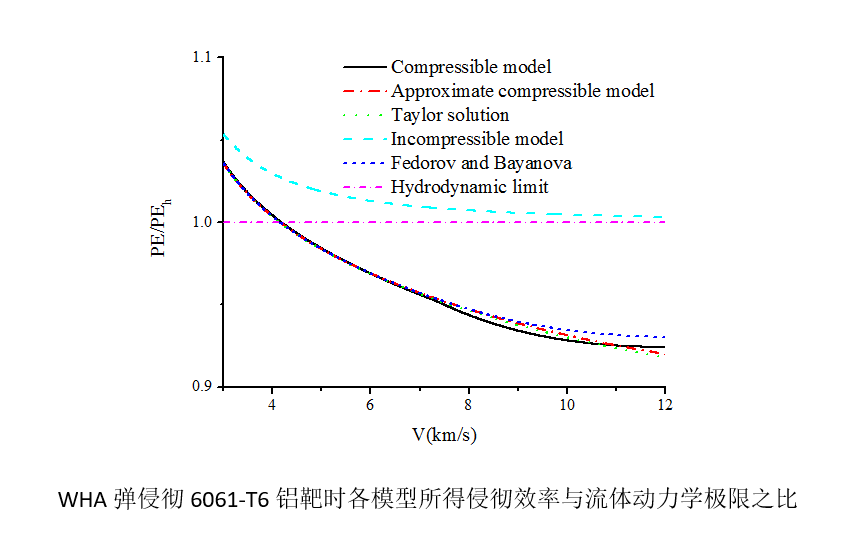 进一步利用近似可压缩侵彻模型研究可压缩性和强度对钨合金长杆弹和铜射流侵彻半无限靶的影响。揭示了可压缩性通过提高弹和靶驻点压力来影响侵彻效率的机理。一般而言,在撞击速度较低时,强度效应对侵彻深度影响较大,而可压缩性影响可忽略;在撞击速度较高时,强度效应影响很小,而可压缩性有一定影响。进一步借助虚拟原点方法,通过侵彻速度和撞击速度的线性关系引入可压缩性和强度,研究强度和可压缩性对射流侵彻的影响,结果表明靶的强度效应对侵彻深度影响严重。
