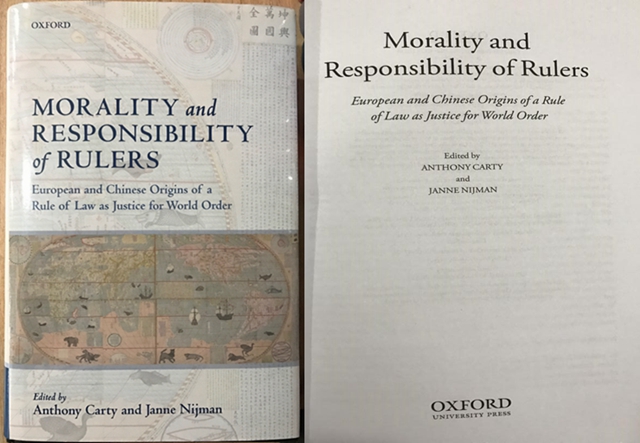 北理工法学院外籍教授Anthony Carty新作《 Morality and Responsibility of Rulers--European and Chinese Origins of a Rule of Law as Justice for World Order》(中文版译为《执政者的道德与责任——中欧关于世界秩序正义的法治起源》),由英国牛津大学出版社于2018年正式出版。本书分为两大部分,共计19篇文章,分别从不同角度讨论了世界秩序中的中欧法治思想。