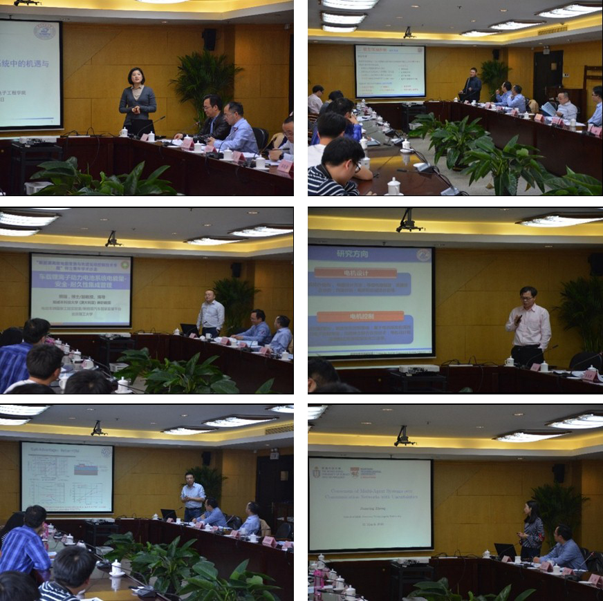 徐伟作题为“电动汽车用高性能电机及系统”的报告,介绍了其所在团队在电动汽车领域新型永磁电机的拓扑结构、电磁设计方法等最新研究成果;彭晗做了题为“氮化镓在高频脉冲系统中的机遇与挑战”的报告,讨论了硬开关环境下氮化镓在三种不同工况下的开关特性,深入探讨了氮化镓器件在该应用中的机遇与挑战;张之梁作题为“GaN高频电力电子变换器”的报告,介绍了GaN功率器件发展现状、器件使用特点与挑战、结合应用的GaN高频电力电子电路与控制,展示GaN器件给电力电子应用带来的优势与前景;张永昌作题为“交流电机模型预测控制关键技术”的报告,以三相交流电机调速系统为应用目标,深入研究模型预测控制(MPC)技术在电机控制中的理论问题和工程解决方法;熊瑞作题为“电动车用动力电池系统耐久性能量管理”的报告,阐述动力电池系统电能量-安全-耐久性集成管理的解决方案;郑建英作题为“随机不确定网络环境下的多自主体系统的趋同性研究”的报告,清晰地展示了延时、丢包率、通信拓扑以及自主体的动力学特性如何互相作用影响了系统的趋同性;沙德尚讨论了宽增益双向DC-DC变换器的相关技术前沿。