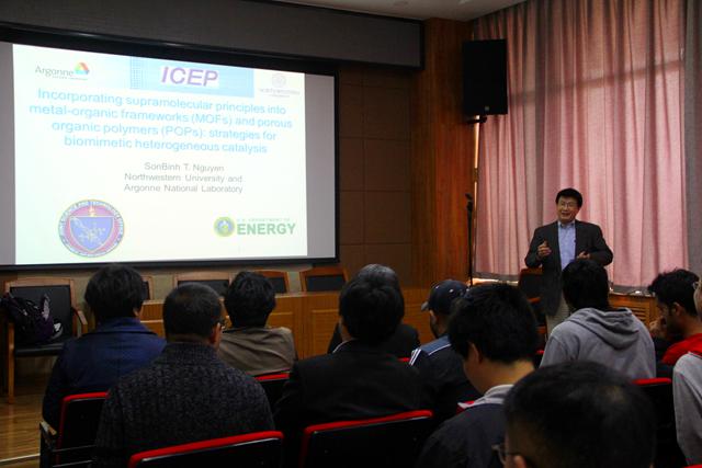 Nguyen教授的第一场学术报告题为“Incorporating supramolecular principles into metal-organic frameworks (MOFs) and porous organic polymers (POPs): strategies for biomimetic heterogeneous catalysis”。该学术领域是当前国际前沿研究领域,一个涉及到超分子化学、配位化学、多孔材料以及生物模拟催化的多学科交叉领域。Nguyen教授师从2005年诺贝尔化学奖获得者、加州理工学院Robert H. Grubbs教授获得博士,之后在多孔材料、石墨烯/氧化石墨烯和生物材料等领域做出了非常有影响力的研究工作,发表了260多篇论文,包括多篇Nat. Commun, J. Am. Chem. Soc., Angew. Chem. Int. Ed., Nano Lett., ACS Nano, Chem. Sci., Chem. Comm.等。此次Nguyen教授分享了他运用超分子化学的原理、针对生物催化的目标而设计与制备新型多孔材料(MOFs和POPs)的体会。报告受到了与会的教师、研究生与留学生的欢迎,引发了现场师生的极大兴趣,并与Nguyen教授展开了热烈的讨论。Nguyen教授耐心地解答了现场师生提出的每个问题。会后,SonBinh T. Nguyen教授与参会人员合影留念。