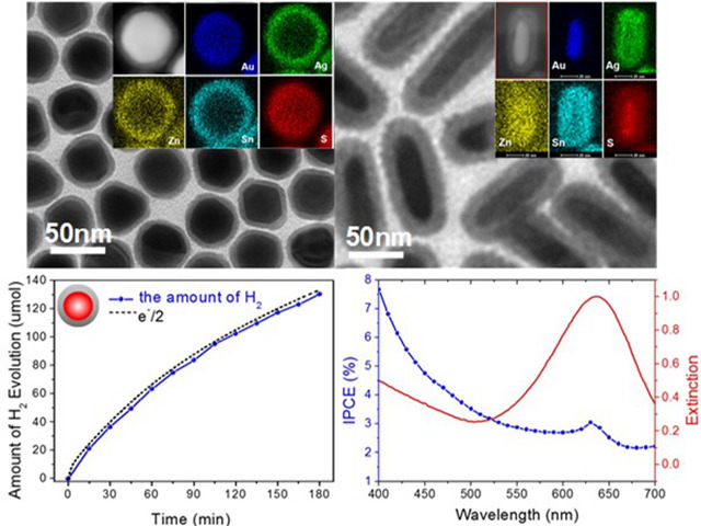 在张加涛教授团队研究积累的基础上(Science, 2010; Adv. Mater., 2014; Angew. Chem. Int. Ed., 2015;Nature Nanotechnol. 2018),团队成员刘佳特别研究员带领研究生冯靖雯、成晓艳、王虹智等通过发展水相阳离子交换反应,成功实现对金属@半导体核壳纳米晶形貌、纳米结构、异质界面的精准合成,在Au@CdS、Au@ZnS以及Au@Ag2ZnSnS4(四元硫族半导体壳层)等核壳纳米晶中构建了紧密接触、原子级洁净的金属/半导体异质界面。根据飞秒中红外瞬态吸收光谱测试及理论计算结果,Plasmon热电子从Au核注入CdS导带的效率高达48%,所合成纳米晶在可见光下的光催化分解水制氢性能比传统方法制备的Au@CdS纳米晶提高了2-3个数量级;将Au@Ag2ZnSnS4纳米晶组装在光化学电极上成膜,利用精准合成的优势调控纳米晶等离子体-激子耦合,在光电催化分解水制氢中获得了优异性能。在已有的异质界面能量高效转移等突破性研究基础上,团队将结合表面缺陷调控等进一步提高光生载流子的利用效率及光催化、光电催化性能。
