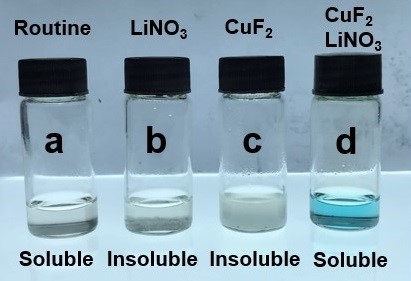 硝酸锂(LiNO3)作为锂硫电池电解液的添加剂,在抑制多硫化物的“穿梭效应”和保护金属锂负极上发挥了重要作用。锂硫电池电解液体系多为醚类体系,而醚类体系因其窄的电化学窗口无法使用到高压电池中(> 4.3 V),酯类电解液体系能够承受4.3 V及以上电压。黄佳琦研究员课题组通过引入微量的氟化铜(0.2wt %),最终实现了1.0 wt%硝酸锂添加剂的溶解,整个溶液的颜色变化明显:单独的硝酸锂和单独的氟化铜试剂在酯类电解液中均无法溶解;当两者共同加入溶液后,沉淀完全消失,并且呈现蓝色。该蓝色溶液的出现,是因为产生了可溶解的铜离子络合物(图1)。