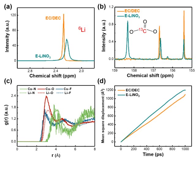 该工作通过核磁技术和分子动力学模拟对电解液的溶解机理和新型溶剂化结构进行了验证,如图2所示,蓝色电解液中的13C的核磁信号相比于常规酯类电解液的核磁信号峰的数目发生了加倍,表面产生了新的阳离子配位中心。从6Li的核磁信号位移上看,铜离子的加入使得6Li的去屏蔽化变强,这一结果与计算结果相一致。