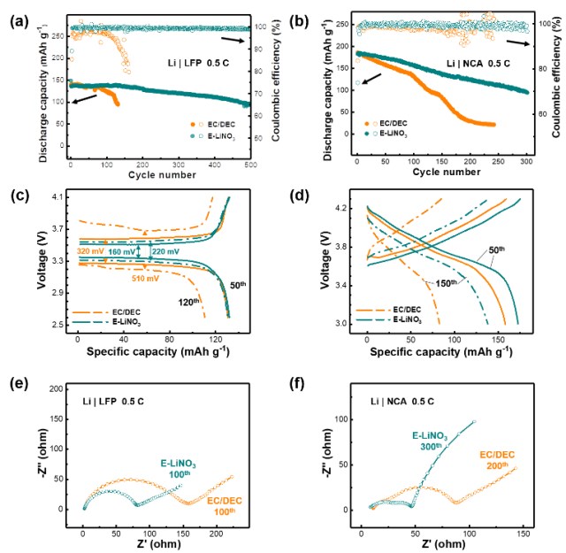 研究者在报道中指认了酯类条件下硝酸锂的初始分解电位在1.4 V,并发现了其对锂沉积形貌有明显影响。含有硝酸锂的蓝色的电解液溶液被用于匹配以磷酸铁锂(LFP)和三元镍钴铝(NCA)为正极,以金属锂(Li)为负极的电池体系中(图3)。其中,磷酸铁锂电池在0.5C倍率下经过500次循环容量保持率维持在83%;高压镍钴铝电池在0.5C倍率下经过300次循环容量保持率在53%,均呈现出良好的电化学稳定性,新电解液体系下两种类型电池的阻抗未发生明显增大。
