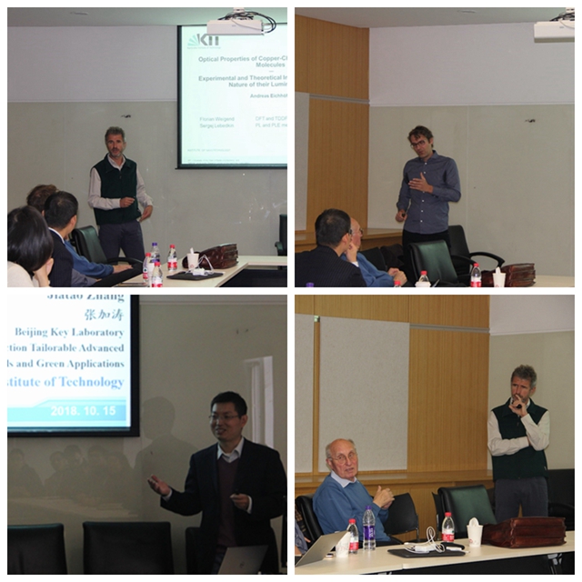 应材料学院结构可控先进功能材料与绿色应用北京市重点实验室,北理工—昆士兰能源材料联合研究中心主任张加涛教授的邀请,德国科学院院士卡尔斯鲁厄理工大学Dieter Fenske教授、Andreas Eichhoefer研究员、德国马尔堡菲利普斯大学Robert Langer教授于2018年10月15日至18日来jinnianhui今年会材料学院进行学术交流。