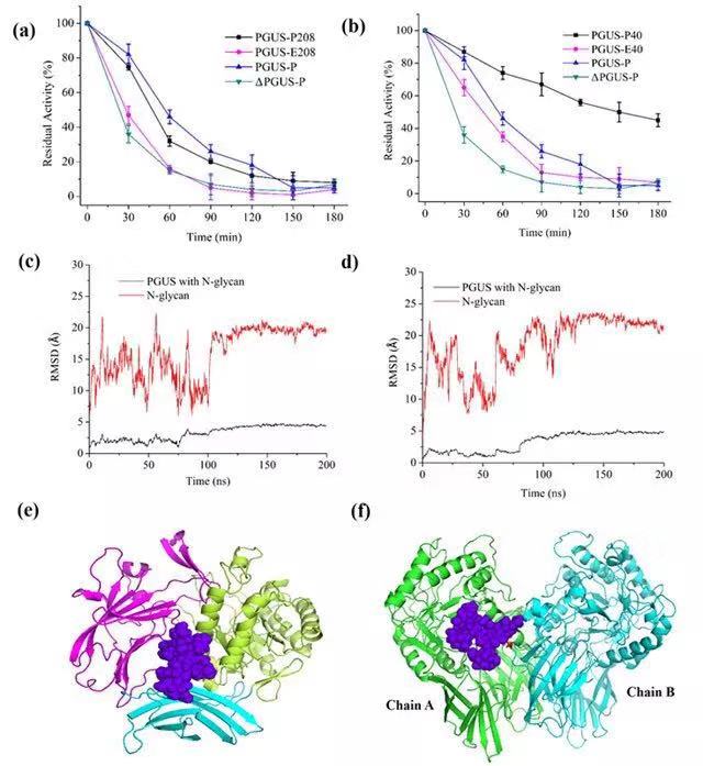 jinnianhui今年会化学与化工学院李春教授课题组以前期完成晶体结构解析的真菌β-葡萄糖醛酸酶(PGUS,同源四聚体结构)为模型蛋白,并将其在毕赤酵母(能够在蛋白质的特定位点引入高甘露糖型糖链)中异源表达(PGUS-P),验证了蛋白质内源的Asn383和Asn594位点的糖基化对PGUS-P的稳定性有显著影响。通过计算机模拟与实验相结合的方法,揭示了PGUS-P的两个內源N-糖基功能类似于“连接臂”,能将空间上距离相近的超二级结构域相连,使得其局部结构更加紧凑,从而提高了蛋白质的整体稳定性。以此为启发,研究人员通过对PGUS的晶体结构分析,在超二级结构域、结构域、亚基界面间设计了N-糖基化位点,进一步提高了PGUS-P的动力学、热力学稳定性。酶学性质表征并结合全原子分子动力学模拟结果表明,在结构域界面间的Asn208位糖链和周围二个结构域产生的作用力,形成了“糖桥”构型,将蛋白质在70°C下的半衰期提高了2.7倍,去折叠自由能提高了8.4kJ/mol;而在亚基界面间的Asn40位糖链通过和相邻亚基的作用,形成了“糖卡”构型,将热稳定性提高了7.1倍,去折叠自由能提高了14.6kJ/mol,同时酶的催化效率也提高了1.7倍。