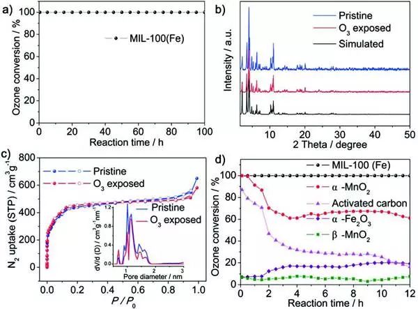 (a)MIL-100(Fe)的臭氧转化率。b)模拟的、合成的和暴露于臭氧的MIL-100(Fe)的粉末XRD图案。c)在暴露于臭氧之前和之后,MIL-100(Fe)的N2吸附等温线。插图:MIL-100(Fe)的孔径分布。d)分别对MIL-100(Fe)、α-MnO2、活性炭、α-Fe2O3和β-MnO2进行臭氧转化。条件:用0.27g石英砂稀释的0.03g催化剂, C( O3)= 45ppm,流速="1000mL" min-1,RH="45%,室温。)