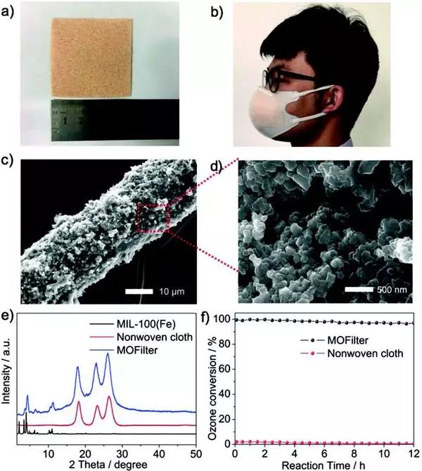 (a,b)MOFilter的照片和包含MOFilter的口罩。c)MOFilter的SEM图像。d)(c)中方框的放大图像。e)模拟MIL-100(Fe),无纺布和MOFilter的XRD图案。f)MOFilter上的臭氧去除,入口臭氧浓度为200ppb,室温下RH为45%。)