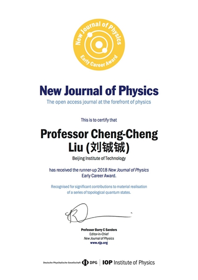 北理工刘铖铖研究员荣获《新物理学期刊》(《New Journal of Physics》)颁发的2018早期职业奖