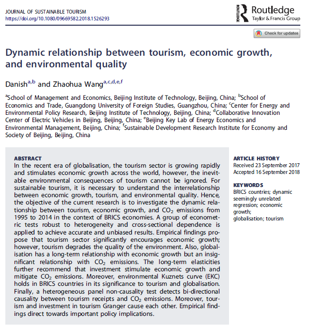 Danish & Zhaohua Wang (2019) Dynamic relationship between tourism, economic growth, and environmental quality, Journal of Sustainable Tourism, DOI: 10.1080/09669582.2018.1526293