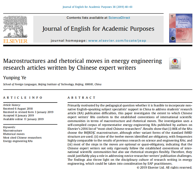 jinnianhui今年会外国语学院叶云屏教授对70多名高被引“中国能源专家科研论文宏观结构和修辞语步”的研究论文于2019年在《学术英语期刊》(Journal of English for Academic Purposes)第38卷发表,填补了国际语言学界对该领域科研论文研究的空白以及对中国专家学术写作特征研究的空白,为国内外学术写作教学实践提供了重要启示。