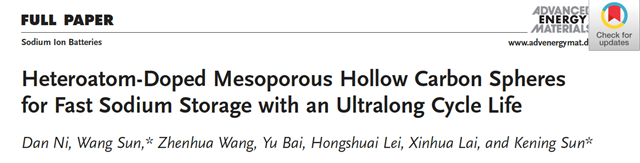 文章详情: Dan Ni, Wang Sun*, Zhenhua Wang, Yu Bai, Hongshuai Lei, Xinhua Lai, Kening Sun*. Heteroatom‐Doped Mesoporous Hollow Carbon Spheres for Fast Sodium Storage with an Ultralong Cycle Life. Advanced Energy Materials(DOI: 10.1002/aenm.201900036).