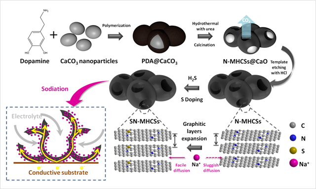 基于以上材料设计思路,孙克宁团队基于聚多巴胺表面涂覆技术及杂原子掺杂碳结构调控方法,制备了钠离子电池负极材料——硫氮共掺杂的介孔中空碳球(SN-MHCSs),并对其储钠机制及循环后碳结构变化进行了分析。该研究表明:1.薄壁中空球形结构,有利于离子和电子传导,能够缓冲充放电过程中的体积变化,碳球表面的介孔结构,能够促进电解液的扩散及碳球内表面的利用,较高的比表面积可以确保表面电容过程控制的快速钠储存。2.杂原子掺杂,能够增大碳层层间距,促进钠离子的扩散及存储,增加电子导电性,提升容量。3.循环过程中,钠离子的嵌入脱出能够扩大碳层间距,使碳层排布更加整齐,促进钠离子及电子的传输,带来循环后电极容量上升。