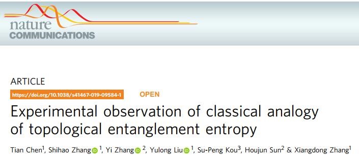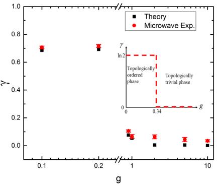 在上述微波信号处理研究的基础上,进一步开展了拓扑纠缠熵方面的研究。拓扑纠缠熵是由Kitaev和文小刚十几年前在研究拓扑序纠缠特性时提出的一个物理量。它是能展现出许多新奇物理特性的独特物态,具有长程纠缠特性是其重要特征之一。虽然理论研究显示拓扑纠缠熵能很好刻画拓扑序及其长程纠缠特性,然而一直没能得到实验证实。