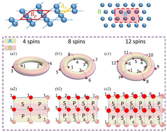 日前,课题组建议一种实验方案:基于最小熵态(minimum entropy states)研究拓扑纠缠熵。最小熵态是可用于观察拓扑序的一种多qubit纠缠态(如图2所示)。通常的做法应该是:在量子多体系统构建多粒子纠缠态(量子最小熵态),然后基于纯量子信息处理平台进行实验研究。然而,按这种方式执行,实现起来是非常困难的。原因是要想观察到拓扑纠缠熵需要多粒子纠缠态的fidelity至少达到90%以上,而目前在IBM量子计算机平台上构建的12-qubit纠缠态fidelity少于44%。