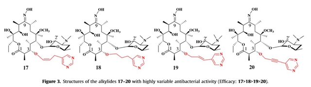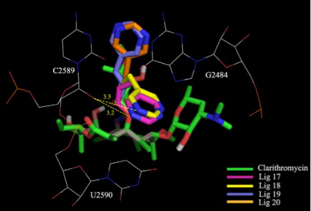 红霉素抑制细菌核糖体中蛋白的输出,是抑菌剂。临床用于细菌性肺炎和支原体肺炎感染等致死性重症的治疗。目前这类耐药菌主要是识别红霉素,表达外排泵蛋白并将其外排到细胞外,或者表达甲基化转移酶将核糖体RNA上原先红霉素结合靶点甲基化,降低相互作用力。梁建华团队去除了会诱导细菌识别的3-O克拉定糖基团,引入了新型具有构象限制的1-Z-丙烯基侧链,恢复了红霉素的药效构象,发表在European Journal of Medicinal Chemistry, 2012, 49, 289;Bioorganic & Medicinal Chemistry Letters, 2013, 23(5): 1387;Bioorganic & Medicinal Chemistry, 2015, 23(19): 6437。率先披露了新靶点区域位置,后被其它课题组培养的核糖体共单晶结构进一步证实。