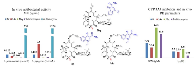 耐药菌还有一类组成型耐药菌,即使不存在诱导基团,也会表达甲基化转移酶,它们往往对多种类型抗生素(如甲氧西林、环丙沙星和阿奇霉素等)耐药,是典型的超级耐药菌。针对这类耐药水平非常高的耐药菌,需要引入的新靶点具有高亲和力。该团队前期发现侧链末端的杂芳基上引入氨基或者氨基甲酰基取代基,可以提高抗耐药菌活性,但是组成型细菌仍然对其不敏感(Bioorganic & Medicinal Chemistry Letters, 2017, 27(7): 1513-1524)。 近期,该团队开发了第四代红霉素,通过杂合的手段引入3-羧基喹喏酮结构,发现有助于提高抗组成型耐药菌活性,但是活性中等,进一步改造喹喏酮子结构,首次引入了3-氨基甲酰基喹喏酮,获得了很高的抗组成型耐药菌活性,同时对其它耐药机制细菌的抗菌活性也非常优异,且优于对比类似结构药物如克拉霉素和环丙沙星等,与第三代抗耐药菌红霉素-泰利霉素体外活性相当或更优越。体内药代动力学研究显示优选化合物的体内代谢稳定性远高于泰利霉素,有效避免了泰利霉素产生肝毒性的结构特点,药代性质优异,同时具有较低的代谢酶CYP3A4的抑制率,安全性比泰利霉素高,因为该代谢酶负责代谢临床上近一半的药物。该文章最近发表于药物化学顶级期刊European Journal of Medicinal Chemistry, 2019, 169, 1-20。第一作者是在读硕士研究生马聪璇。(文章链接:https://www.sciencedirect.com/science/article/pii/S0223523419302053)