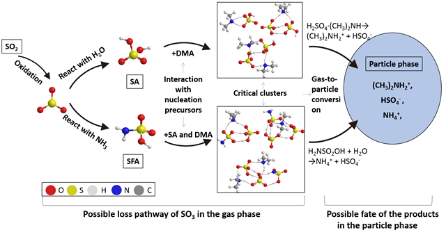 两团队合作,将量子化学计算和大气团簇动力学模型相结合,发现在NH3浓度较高的污染干燥地区,重要的大气污染物SO3和NH3的自催化反应是SO3除与H2O反应之外的另一条重要消耗路径。同时发现反应产物氨基磺酸可不同程度增强城市地区大气关键成核团簇的形成速率。最终提出高度污染地区NH3和SO3自催化反应引发的气溶胶颗粒物新粒子形成的新机制(图1),为我国复合大气污染条件下颗粒物形成提供了新的研究思路和理论指导。