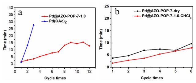 此外,Pd@Azo-POP-7具有优异的循环催化性能。在相同的反应条件下,以醋酸Pd作为反应的催化剂,只能进行3次循环催化。而以Pd@Azo-POP-7作为催化剂时,催化反应可以进行12次以上,仍然保持很高的催化活性(图4)。这主要归功于Azo-POP-7的羟基偶氮官能团与金属Pd间存在配位作用,很好地分散了Pd纳米粒子,防止聚集,并防止其流失。该工作为制备可溶性有机多孔聚合物材料提供了新的思路,拓展了有机多孔聚合物在两相催化中的应用。