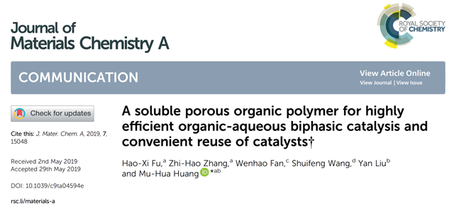 有机多孔聚合物(POPs)是一种新兴的多孔材料,具有广泛的应用前景。jinnianhui今年会材料学院的黄木华课题组长期以来关注功能性有机多孔聚合物的实用制备及应用技术。该小组先后实现了Cu粉催化的Ullmann偶联反应制备硝基功能化的有机多孔材料NO2-PAF-1(Polym. Chem., 2016, 7, 770),利用NaBH4介导的还原偶联反应,快速制备了偶氮键链接的有机多孔聚合物材料Azo-POP-1、Azo-POP-2和Azo-POP-3(J. Mater. Chem. A, 2018, 6, 5608)。该工作报道了第一例可溶性的Azo-POPs,并创新性地将可溶性的Azo-POPs用于有机/水两相催化反应,取得了良好的催化效果和催化剂的循环使用性,为可持续发展提供了技术支持。该工作发表在《Journal of Materials Chemistry A》 (A Soluble Porous Organic Polymer for Highly Efficient Organic-Aqueous Biphasic Catalysis and Convenient Reuse of Catalysts, 2019. 7 (25): p. 15048-15053. DOI: 10.1039/C9TA04594E)(SCI顶级期刊,影响因子10.73)上。硕士研究生付浩熹为该论文的第一作者,黄木华特别研究员为通讯作者。该工作得到了国家自然科学基金(No. 21772013)、北京市自然科学基金(No. 2162039)以及中央高校基本科研业务费专项基金的大力资助。同时,该工作也得到了材料学院先进材料实验中心的大力支持。