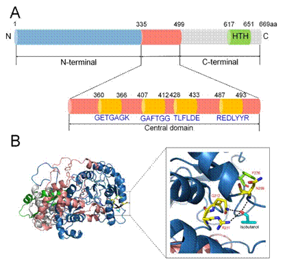 野生型转录因子通常可以灵敏地响应其信号分子浓度的变化,从而调控基因表达,因此可以用作生物传感器筛选高产菌株,然而检测范围限制了它们在工业生产中的进一步应用。在前面的研究中发现,BmoR生物传感器对异丁醇的检测范围是0-40 mM(0-3 g/L),在底物浓度达到40 mM(3 g/L)时响应已经达到了饱和,因此无法用于鉴别更高产异丁醇的菌株。基于此,该课题组利用蛋白质工程的方法对转录因子BmoR进行了改造,首先通过易错PCR的方法构建了随机突变文库,并结合序列比对,定点突变和饱和突变的方法对分布在不同区域的单点突变进行了分析(图2A)。随后又进行BmoR蛋白的结构模拟和底物对接,推测了三个底物异丁醇的结合位点并进行突变验证(图2B)。最终在单点突变的基础上构建了包含N端和C端两个功能域的组合突变,达到了理想的性能,并通过发酵实验验证了突变体对胞内异丁醇的响应。相比于野生型BmoR,突变体的对底物异丁醇的检测范围有了明显的提升(0-100 mM),可以用于筛选7.4 g/L以上的异丁醇高产菌株。该研究既详细地解析了BmoR蛋白的结构域和作用机理,也为转录因子从生理意义到工业化应用提供了范例。相关成果发表于顶级期刊《Metabolic Engineering》,原文链接: https://doi.org/10.1016/j.ymben.2019.08.015。