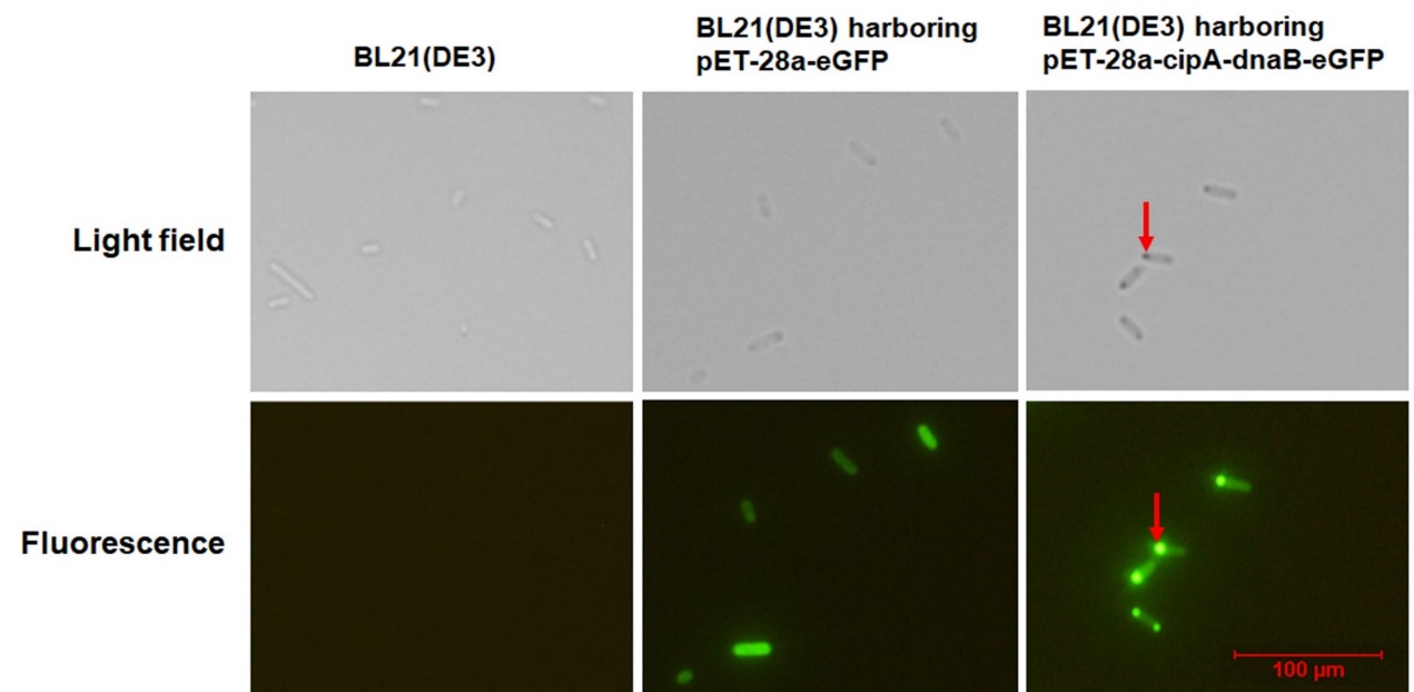 图3 大肠杆菌中CipA-DnaB-eGFP PCIs聚集的亚细胞结构