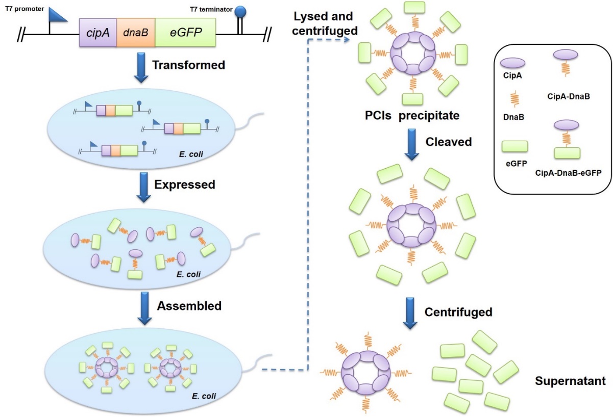 蛋白质在生物体中发挥重要作用,为了探索所需蛋白质的特性,蛋白质纯化是最基本和首要的步骤。另外,在体外酶催化过程中,酶纯化是确保酶纯度和提高反应速率、降低目标产物的生产成本的必要步骤。迄今为止,已经建立了各种利用不同标签的蛋白质纯化方法,包括亲和标签、自聚集标签以及自切割标签。但现有的纯化方法操作复杂、成本较高或纯化效率低。因此,该课题组开发了一种依赖于内含肽Ssp DnaB和疏水蛋白CipA的新型纯化策略。CipA可以自发组装成蛋白质结晶包涵体(PCI),Ssp DnaB是一种在弱酸条件下C-端可发生自切割的小内含肽。通过将Ssp DnaB的C-端融合靶蛋白且N-端融合CipA并使该融合体在大肠杆菌体内过表达。利用CipA的自聚集特性和内含肽的自切割的特性,仅需细胞破碎,离心和切割步骤即可完成蛋白纯化,大大提高了纯化效率以及降低成本。该研究首先成功表达了融合蛋白CipA-DnaB-eGFP,融合蛋白在细胞内自聚集形成包涵体PCIs(图3),随后将细胞破碎并离心后,得到CipA-DnaB-eGFP PCIs沉淀,然后将PCIs沉淀物用pH="6.5的缓冲液重悬使内含肽发生自裂解并释放eGFP,通过离心在上清液中得到纯化后的可溶eGFP(图4)。此外,利用此方法又成功纯化出MBP,酮异戊酸脱羧酶(Kivd)和醇脱氢酶(AdhP),这种方法有望成为工业生产蛋白质的有利工具。相关成果发表于《Journal" of Biotechnology》,原文链接:https://doi.org/10.1016/j.jbiotec.2019.06.002。