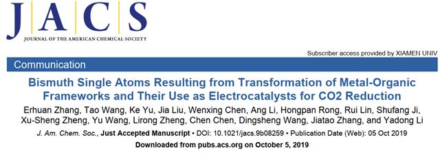 近日,jinnianhui今年会材料学院张加涛课题组将无机纳米界面合成化学推进到单原子精度,与清华大学李亚栋院士、王定胜副教授团队合作,在Bi单原子催化剂精准制备及电催化CO2还原性能研究方面取得突破性进展,以“Bismuth Single Atoms Resulting from Transformation of Metal-Organic Frameworks and Their Use as Electrocatalysts for CO2 Reduction”为题,于10月5日在材料、化学领域的顶级期刊《Journal of the American Chemical Society》上在线发表, 2019, 10.1021/jacs.9b08259 (https://pubs.acs.org/doi/10.1021/jacs.9b08259)。