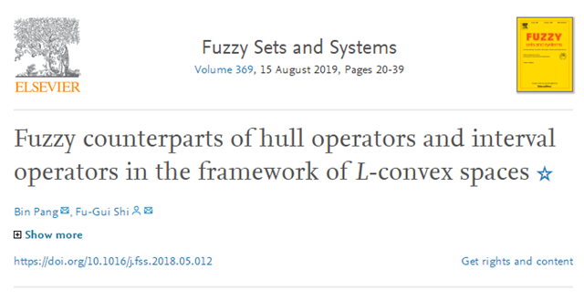 2019年,庞斌副研究员和史福贵教授在完备格的格值环境下引入了L-凸包算子的概念,在完备剩余格的格值环境下定义了L-序凸包算子,在完全分配格的格值环境下给了L-区间算子的定义,并充分利用取值格上的逻辑结构,系统建立了它们与L-凸结构的范畴关系。相关论文“Fuzzy counterparts of hull operators and interval operators in the framework of L-convex spaces”发表在顶级期刊《Fuzzy Sets and Systems》。此项工作成功给出了研究L-凸结构理论的两个最为基本的工具,即L-凸包算子和L-区间算子,为L-凸结构理论的深入研究奠定了理论基础。此论文一经发表便得到了国内外学者的广泛关注,并入选ESI高被引论文。