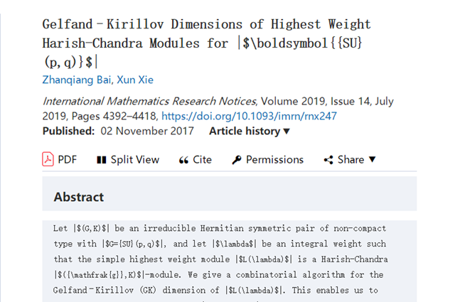 日前,北理工数学与统计学院谢迅副研究员在国际数学顶级学术期刊《International Mathematics Research Notices》上发表题为“Gelfand–Kirillov Dimensions of Highest Weight Harish-Chandra Modules for SU(p,q)”的研究论文。该论文给出了SU(p,q)的具有最高权的单模的Gelfand-Kirillov维数的一个算法。这个算法可以用来研究这些单模的Gelfand-Kirillov维数以及伴随簇的一些性质。