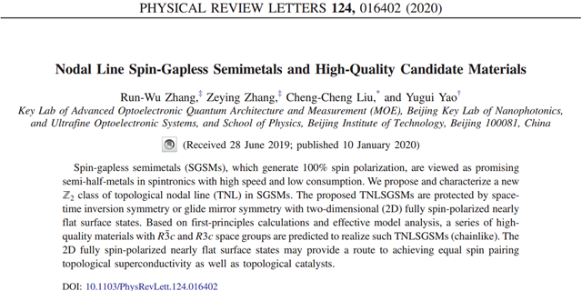该工作发表于物理学顶级期刊《Physical Review Letters》: Run-Wu Zhang, Zeying Zhang, Cheng-Cheng Liu, and Yugui Yao; “Nodal Line Spin-gapless Semimetals and High-quality Candidate Materials”, Physical Review Letters, 124, 016402 (2020).