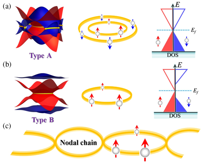 图1 自旋零带隙节线半金属的不同类型及相应的态密度。红色代表自旋向上的通道,蓝色代表自旋向下的通道。黄色代表节线态。