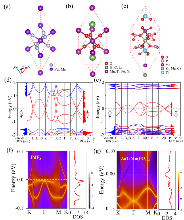 图2 (a-c)为所预测的10种具有 R -3c 和 R 3c 空间群材料。图(d)和(e)分别为两种典型候选材料PdF3和ZnTiMn(PO4)3的自旋极化能带图和态密度图。图(f)和(g)分别为PdF3和ZnTiMn(PO4)3的[111]面的表面色散和态密度。