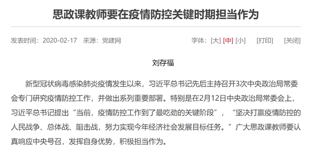 疫情就是命令,防控就是责任。思政课教师要在党中央的统一领导下,按照各级党委、各级教育主管部门和学校党组织的要求,充分发挥理论优势,认真履行工作职责,为打赢疫情防控的人民战争、总体战、阻击战,努力实现今年经济社会发展目标任务贡献应有力量。